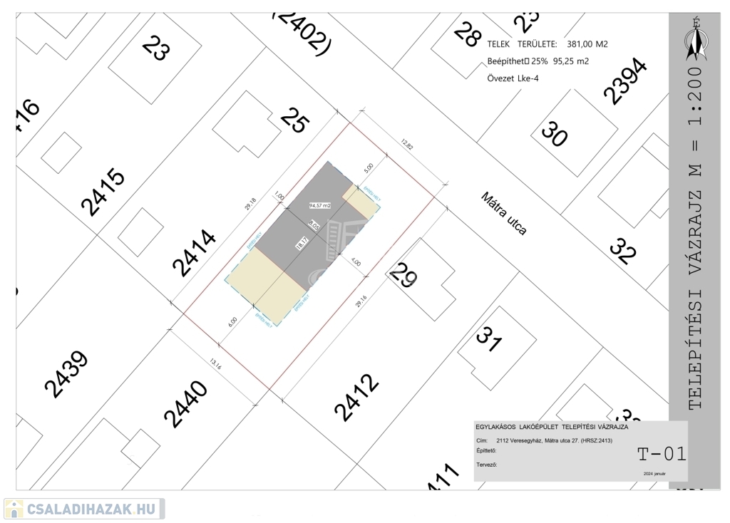 Veresegyház egyik legkedveltebb, csendes részén, a Mátra utca 37. szám alatt, 381 m²-es telken kínálunk eladásra egy nettó 122,36 m²-es, önálló családi házat, amely 2 hónapon belül kulcsrakész állapotban kerül átadásra. A házra CSOK Plusz és Otthon Start is igényelhető, a műszaki tartalom pedig igény szerint, rugalmasan választható.