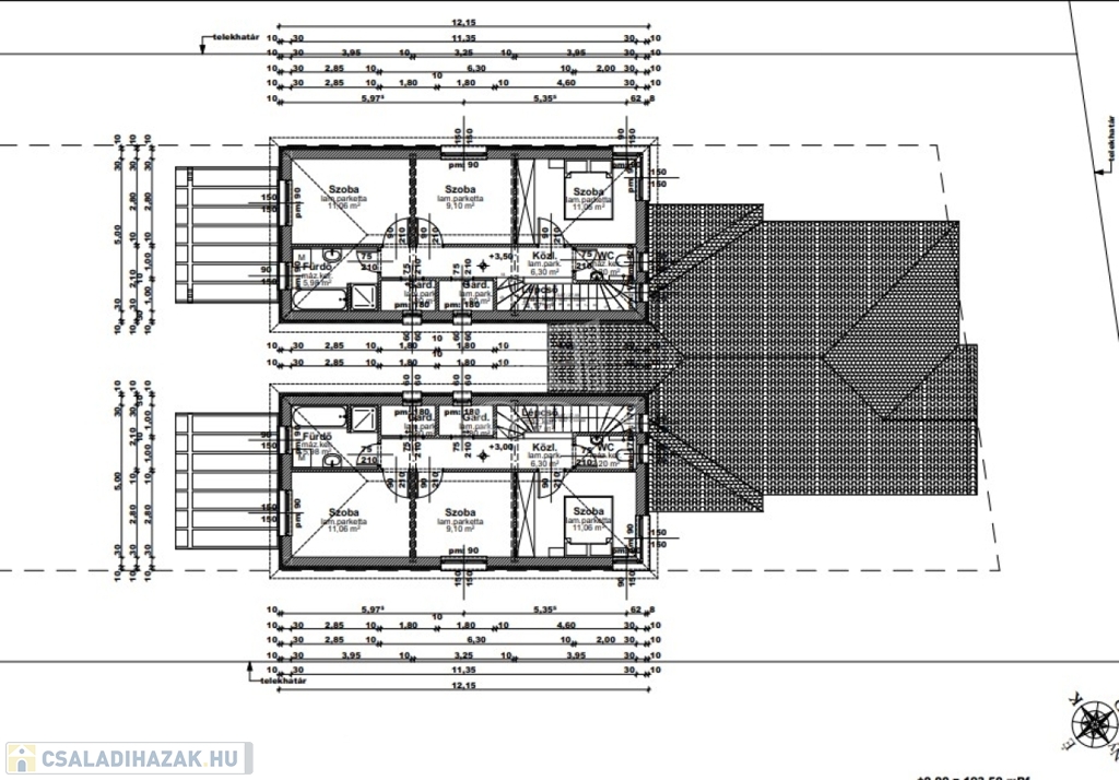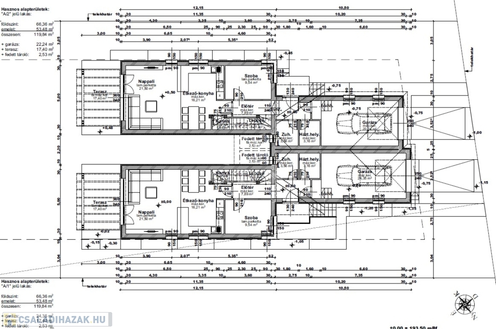 Mindkét ikerház fél nettó 120 nm hasznos alapterületű két szintes épület + mindegyikhez tartozik egy-egy garázs és tároló. A házrészek itt kapcsolódnak egymáshoz.