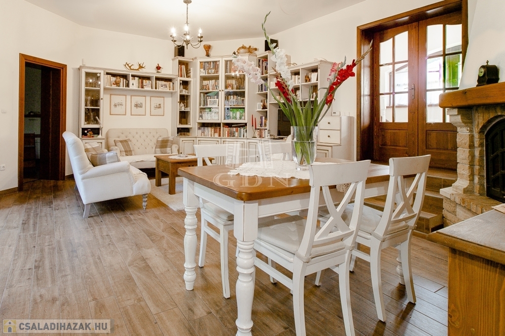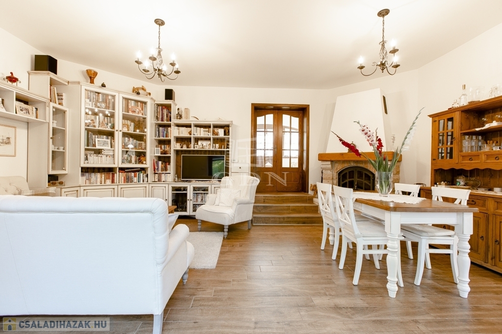 - Kandalló a nappali központjában, amely otthonos, elegáns hangulatot teremt.