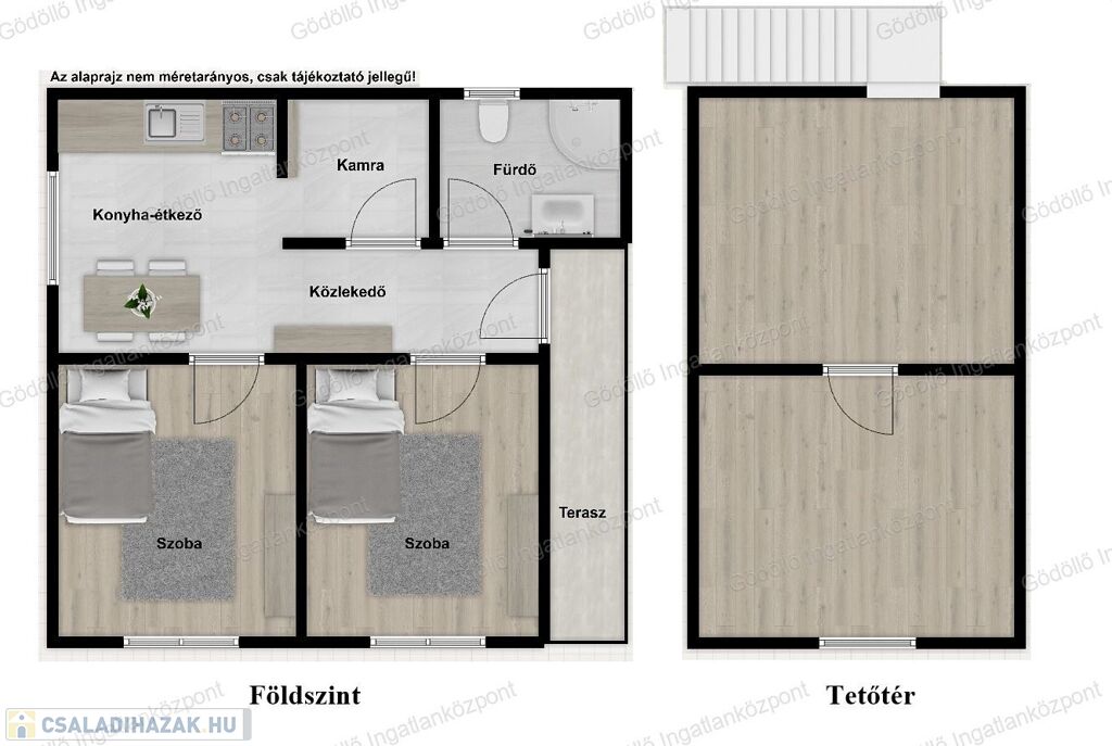 A földszint kb. 34 nm-es, praktikus elosztású: konyha, kamra, két félszoba, fürdő-WC és közlekedő került kialakításra, ill. egy 6nm fedett terasz is tartozik hozzá. Tetőtere emelt szintű készültségű.