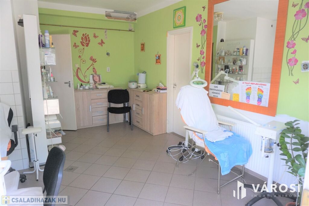 -60nm-es ingatlan(17nm-es kozmetikai szalon(wc-vel és kezelő helyiséggel),amerikai konyhás nappali, lakószoba, fürdőszoba, gardrób és külön wc)