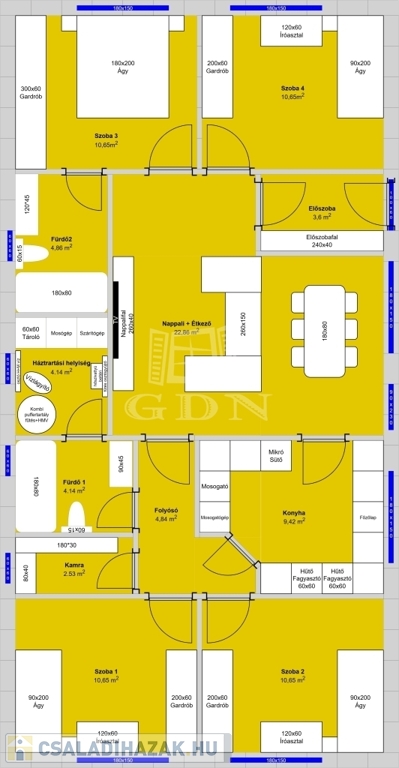 Tervezett elosztás: 4 hálószoba, amerikai konyhás nappali, 2 fürdőszoba, ablakos kamra