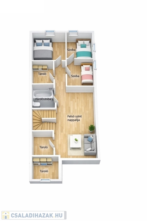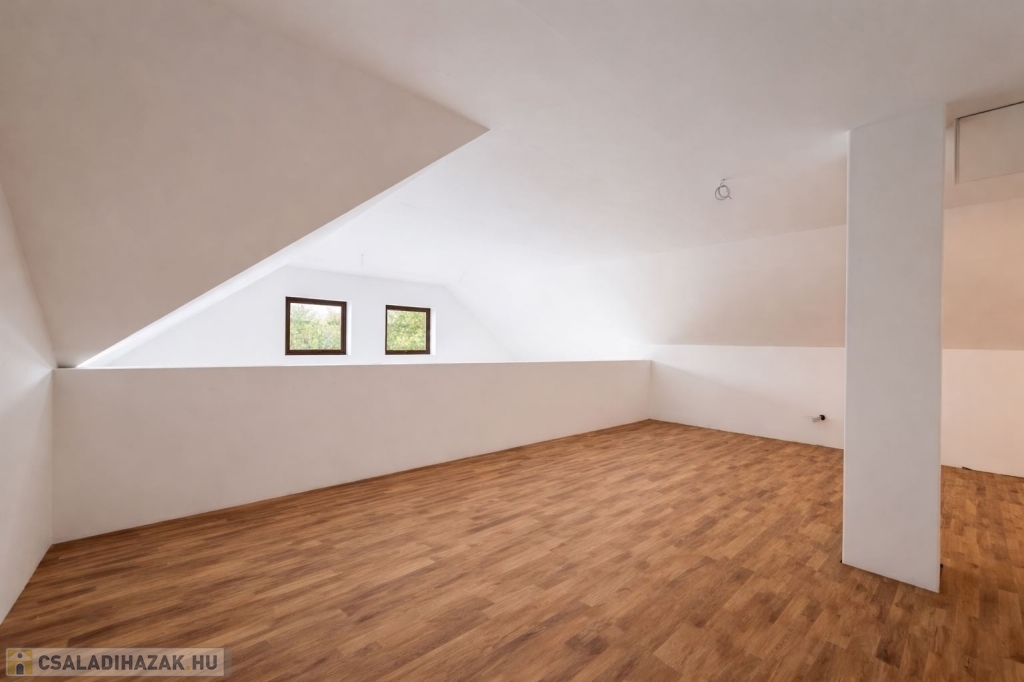 - Emelet: több hálószoba és egy galériás tér – dolgozószobának, játszószobának vagy második nappalinak is ideális