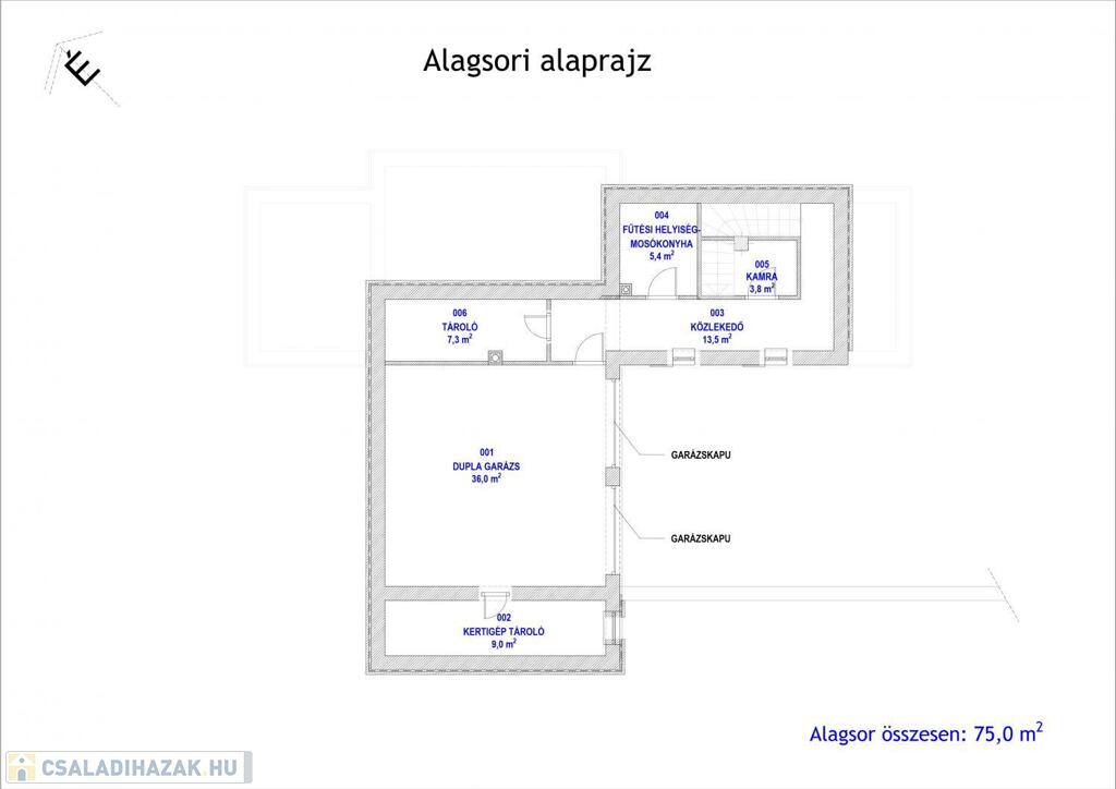 Alagsor: duplagarázs, tárolók, kamra, mosókonyha, kazánhelyiség.