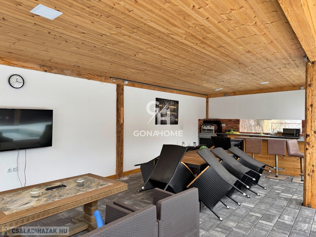 - 75 m²-es TERASZ több ponton fedett, beépített, 6 személyes WELLIS JAKUZZIVAL, zuhanyzóval, valamint fűthető, fokozatosan mélyülő MEDENCÉVEL (legmélyebb pontja 2 méter, a medence elején NAPOZÓ- és sekély PANCSOLÓRÉSZ került kialakításra