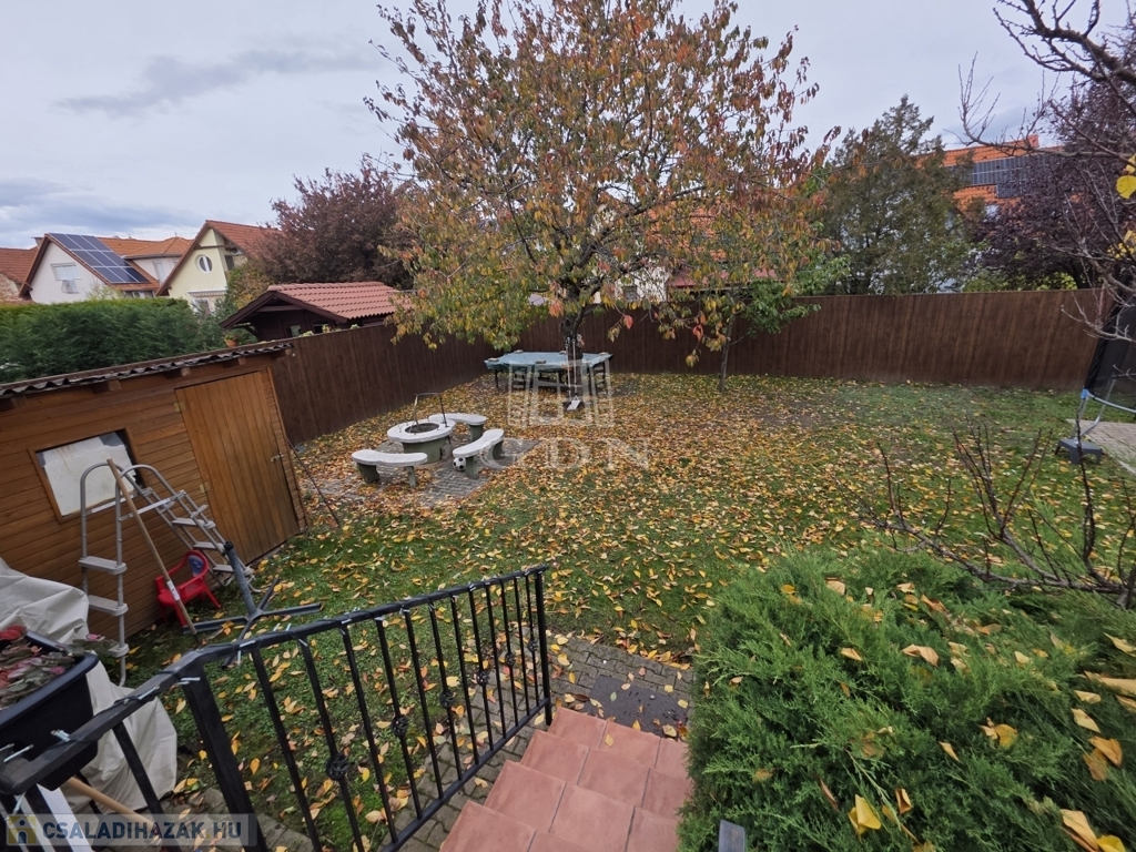 A 439 m²-es, szépen karbantartott és parkosított kert igazi nyugalomsziget. A telek hátsó részén automata locsolórendszer működik, a ház előtti részen pedig térkövezett gépkocsibeálló biztosít kényelmes parkolást akár több autó számára is, a házhoz tartozik továbbá egy tágas, kb. 30 m²-es garázs.