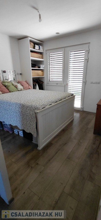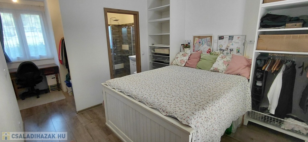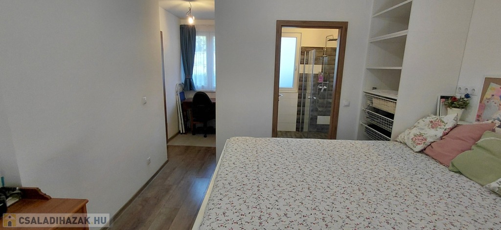 -az emeleten (77nm): három hálószoba egy fürdő-WC (itt még burkolás szükséges) és egy külön Wc került kialakításra. Ezen kívül egy gardróbon keresztül egy 26 nm-es vendégszoba található, mely külön lakrészként is használható.