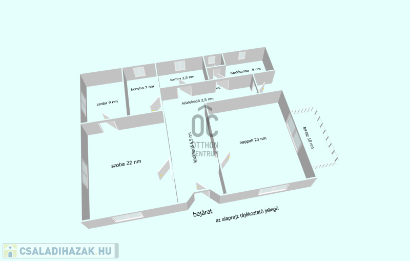 - belső kialakítás: 2 db 23 nm-es tágas, világos szoba, félszoba, konyha+étkező, kamra, közlekedő, zuhanyzós fürdőszoba helyiségekből áll,