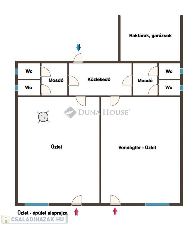 - Egy 100m2 méretű, vállalkozásra alkalmas épület, mely üzlet és vendéglátóhely besorolással is rendelkezik. Két nagyobb (40m2-es) utcai bejáratú üzlethelyiség található benne, illetve a hozzá kapcsolódó mosdók, vizesblokkok. Az épület jó állapotnak örvend, korábban tetejét felújították, külső homlokzata is rendezett.