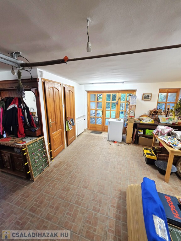 Földszint: Étkező/nappali, innen tudunk felmenni az emeletre, valamint a lenti hálószoba és fürdőszoba is innen nyílik. Mosókonyha, mellékhelyiség, garázs vagy műhely, ez a helyiség könnyen szobává is alakítható, innen 2 kisebb tároló nyílik. Innen az udvar hátsó részére teraszajtó nyílik.