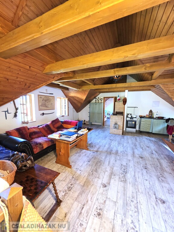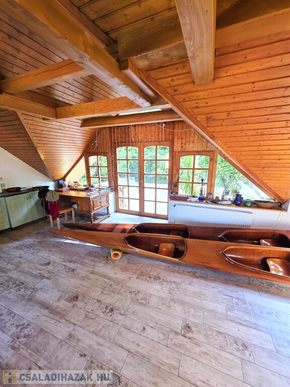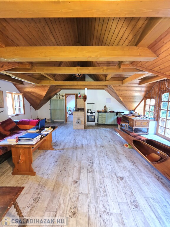 Tetőtér: Tágas nappali, jelentleg itt található a konyha, innen nyílik a fenti hálószoba, onnan pedig a fürdőszoba. Az emeleten található egy igen nagy terasz, ahonnan a kert első és hátsó felébe is lesétálhatunk.