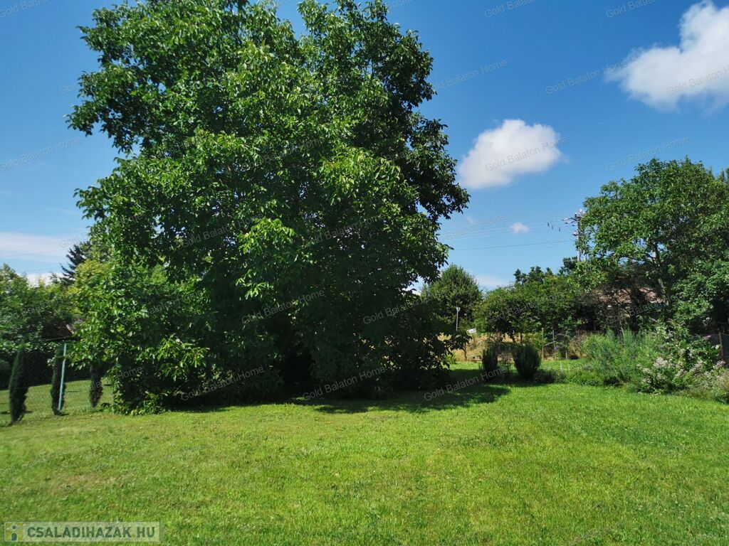 - kerítéssel határolt telek, fiatal gyümölcsfákkal