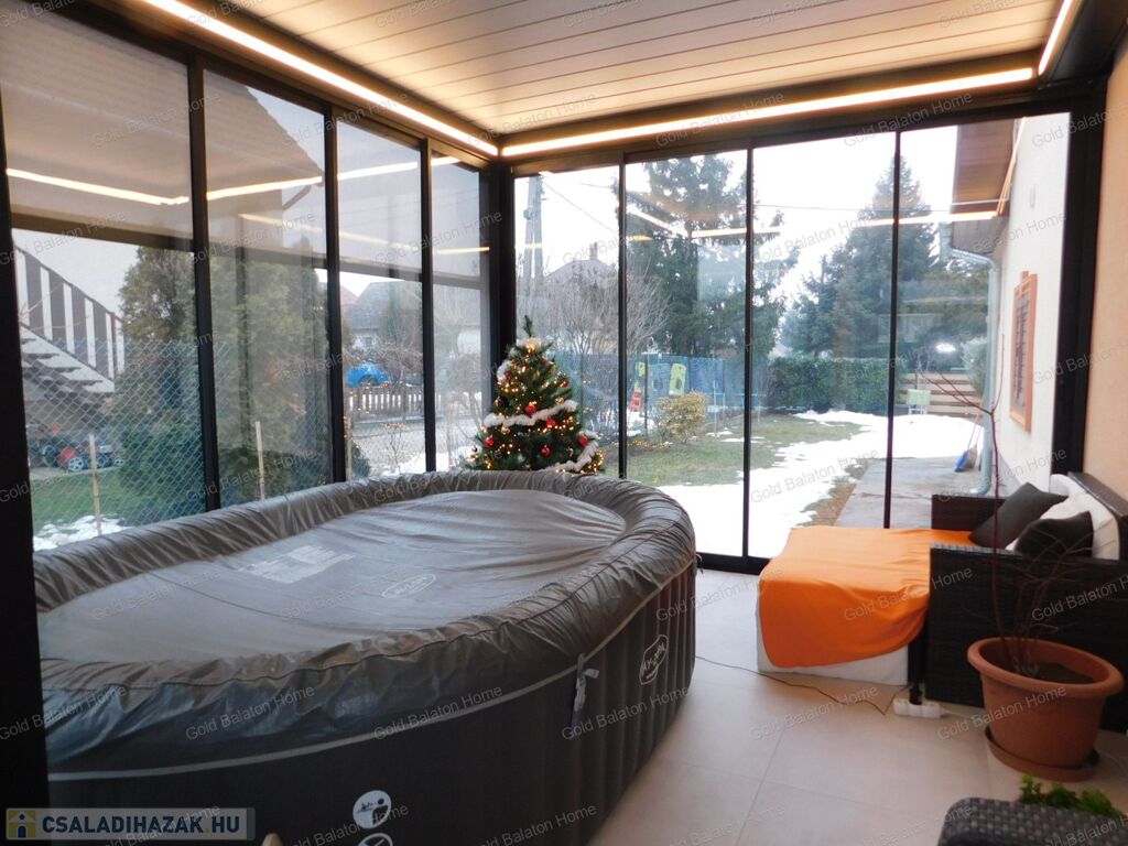 - 2024-ben épült a fűthető télikert árnyékolókkal, elektromos tetőszerkezettel, toló ajtókkal, benne 7 személyes jakuzzival.