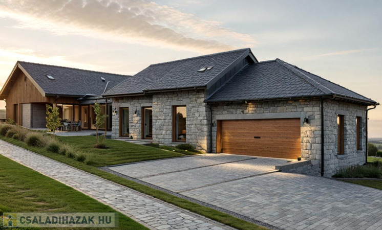 A házhoz tartozó impozáns garázs, elegáns kő- és faelemekkel díszített homlokzat, valamint gondosan megtervezett kert biztosítja a valódi luxus életérzést.
