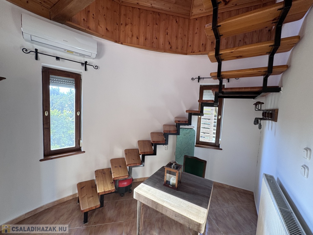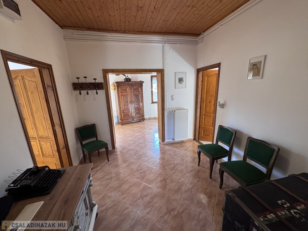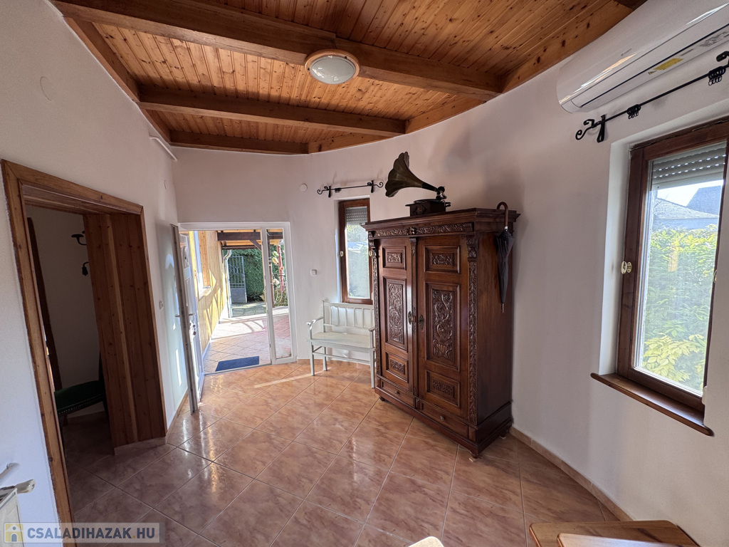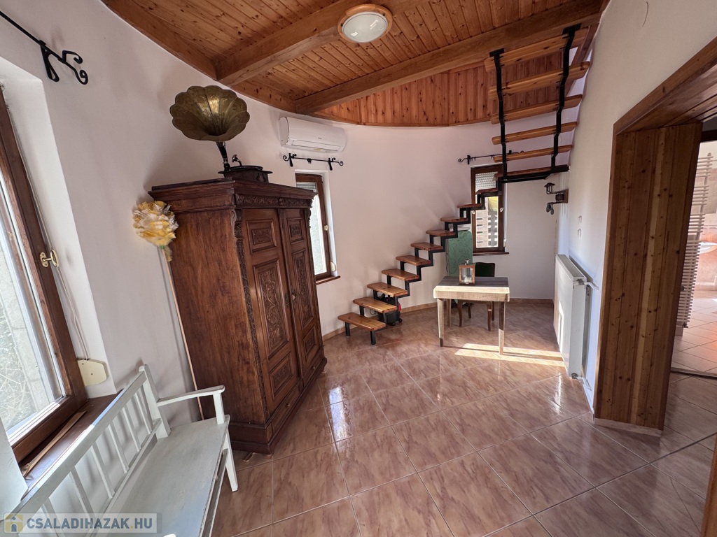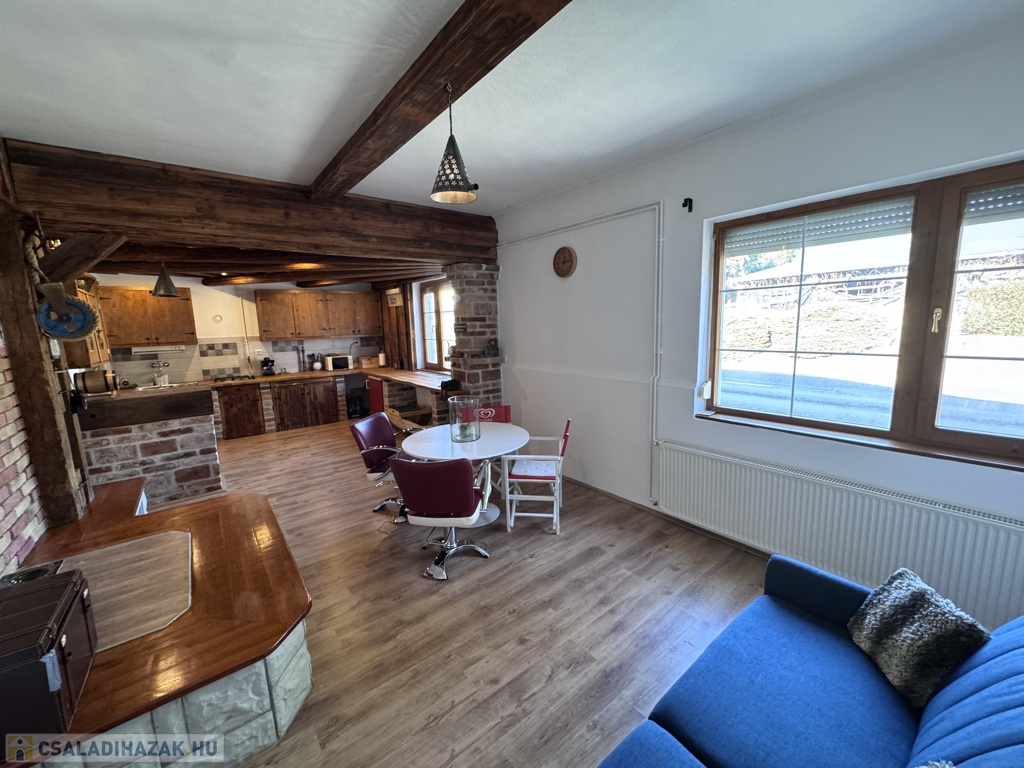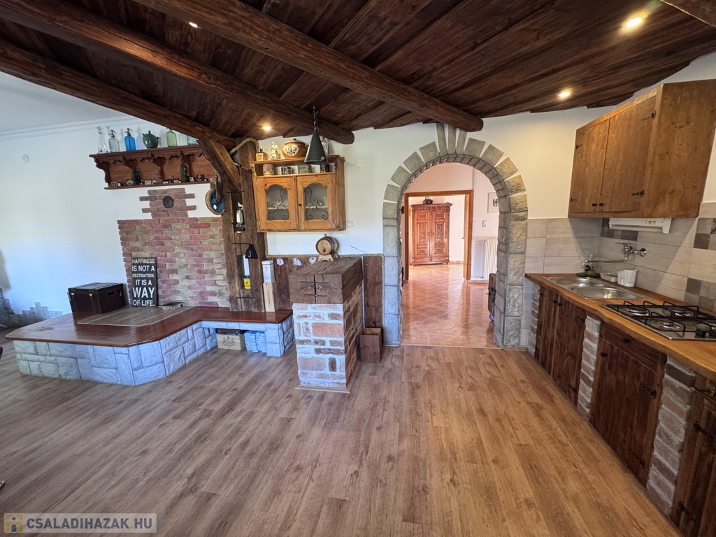 Az ingatlan egyik legszebb éke a nappali impozáns, fagerendás mennyezete, amely egyedi atmoszférát ad a térnek. A téglából épített konyhapult tovább erősíti a mediterrán hangulatot, amely végigkíséri a ház teljes arculatát.