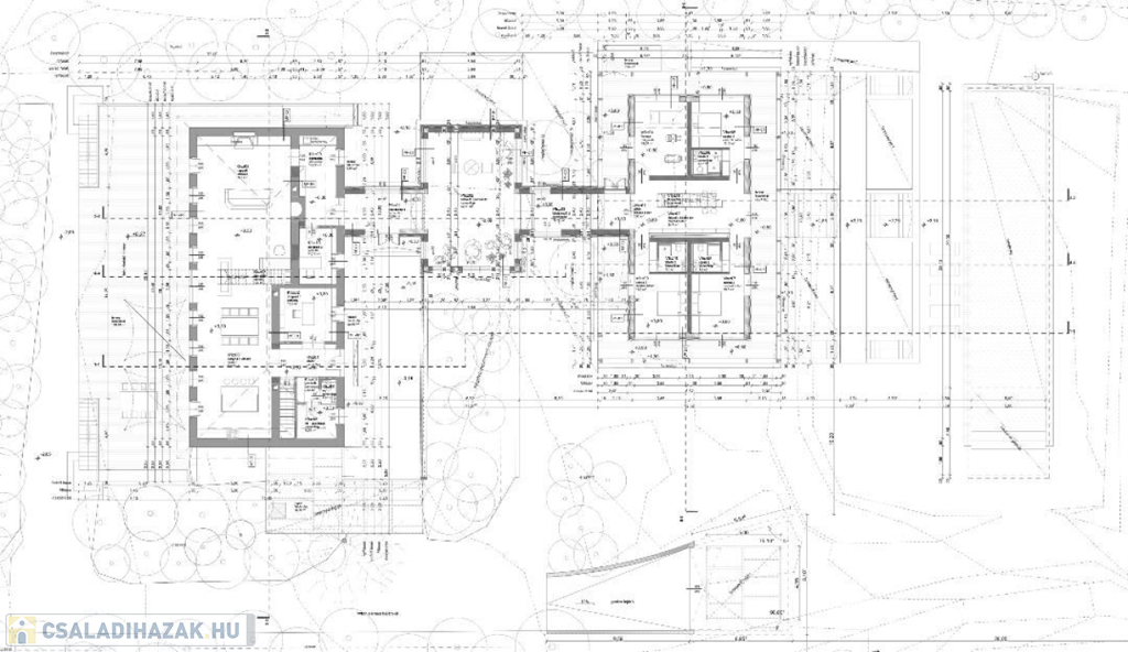 A meglévő kúria épületben földszinten kap helyet a nappali élet színtere. Előszoba, mosdó, háztartási helyiség(gépészet), két dolgozó szoba, konyha+étkező, a tetőtérbe felvezető lépcső, nappali, társalgó. A tetőtérben 2 hálószoba, gardrób és két fürdőszoba kialakítása az igény.