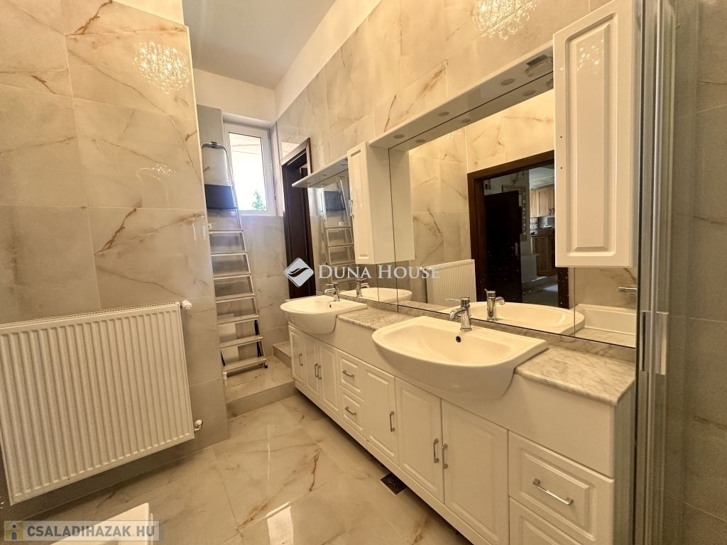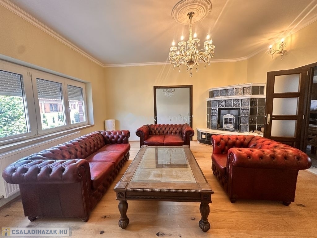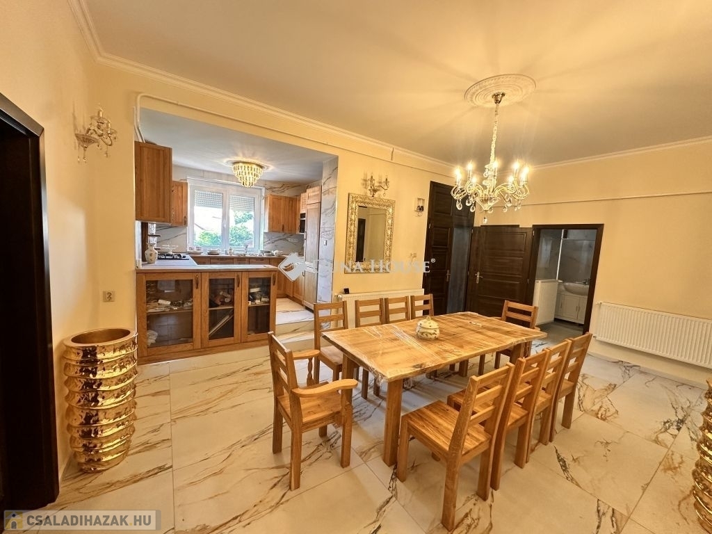 Eladó ez a 222 m2-es, 2000-ban újraépített és bővített, majd 2025-ben teljesen megújult, kétszintes, polgári stílusú, klasszikus családi értékeket képviselő téglaépítésű családi ház.
