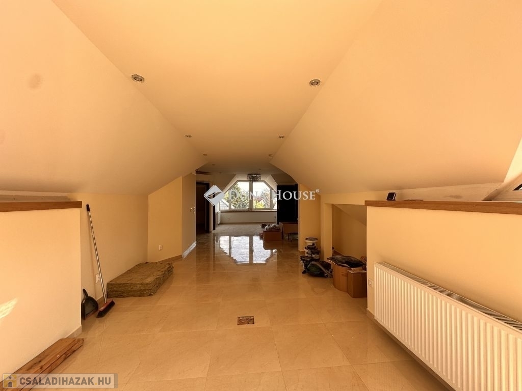 Földszinten: egy tágas és igazán ízlésesen berendezett gyönyörű cserépkályhával ellátott nappali, három egymásból nyíló szoba, ami külön-külön is megközelíthető, konyha ami kapcsolatban áll az étkezővel, a fürdőszoba, melyből az egyik közvetlenül a gardrób mellett áll, különálló WC, optimális méretű spejz, és egy hatalmas, világos előszoba, a gyönyörű fából készült lépcsőházzal.