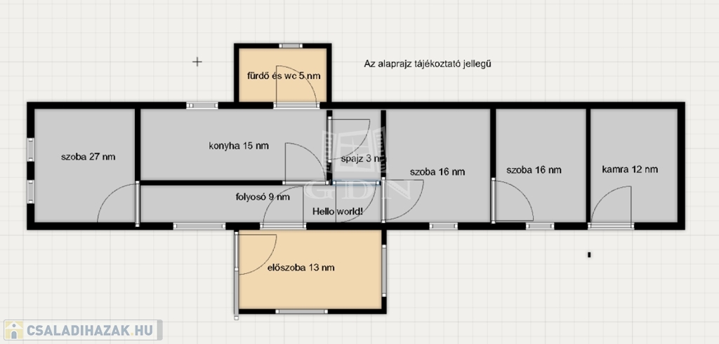 A házban három szoba kapott helyet: kettő külön a folyosóról nyílik, míg a harmadik az egyik szobából érhető el.