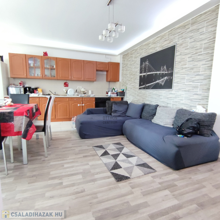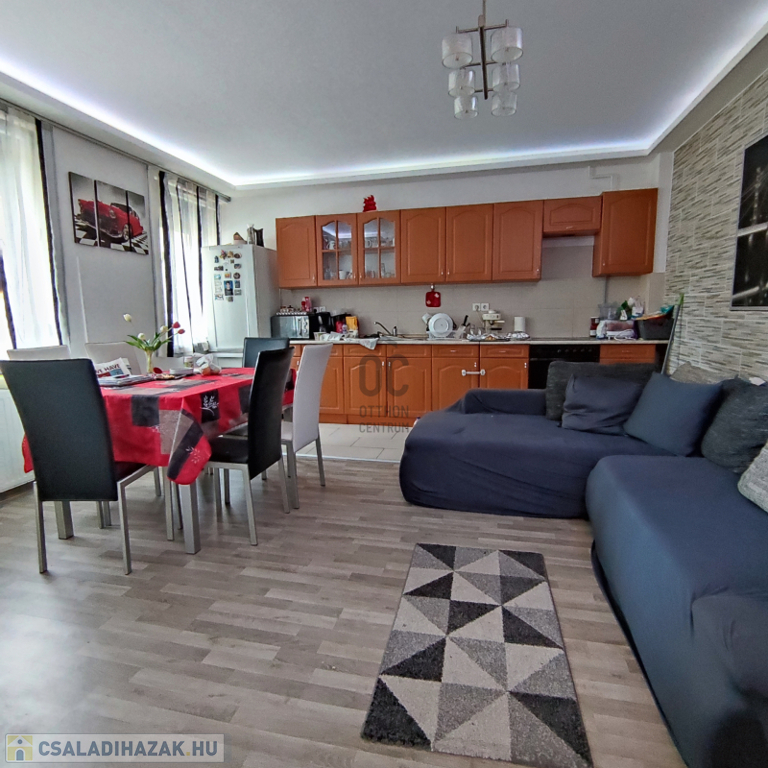 A felújított - de karbantartásra szoruló - lakrész az amerikai stílusú nappali a konyhával és az étkezővel egy légtérben található.