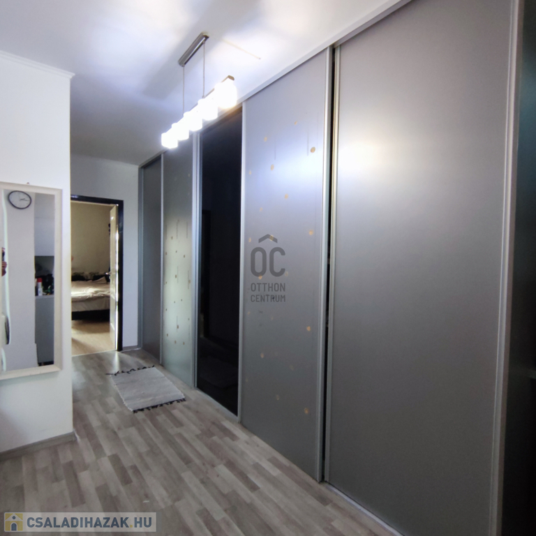 A közlekedőben nagyméretű, kiváló tárolási lehetőséget nyújtó, egyedi, méretre készíttetett beépített szekrény nyújt tárolási lehetőséget. További kettő szoba tartozik még a felújított részhez.