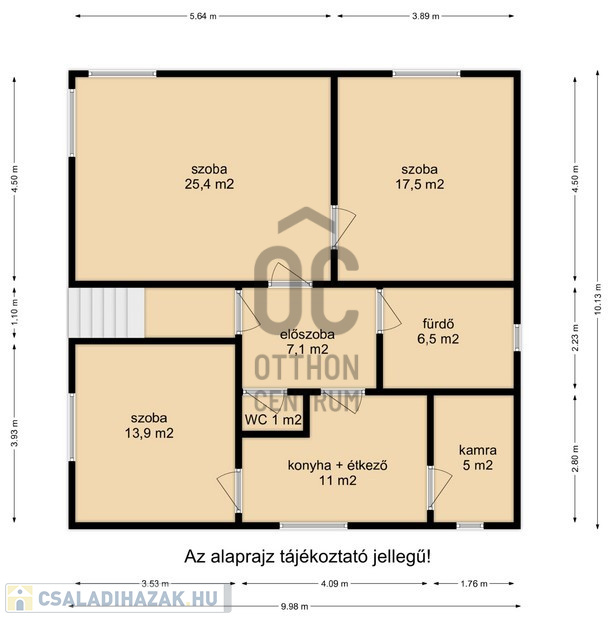 Tájolás: Kelet–Nyugat, így a ház napfényes és világos.