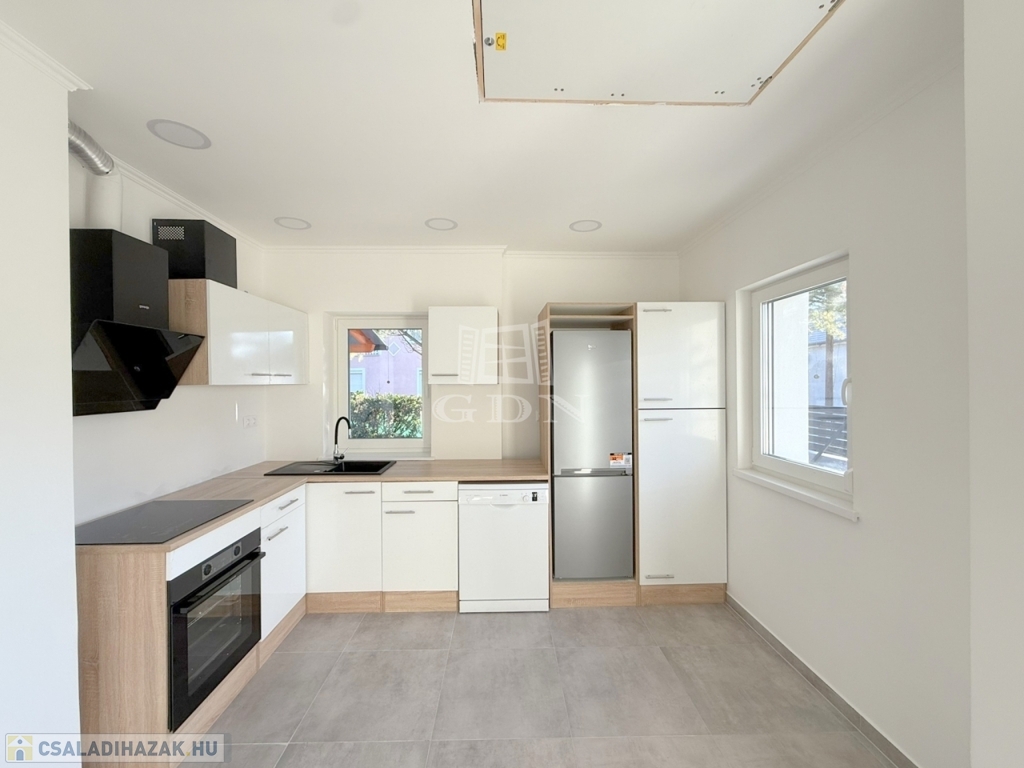 Konyhája teljes mértékben gépesített, a beépített mosogatógép, hűtő, sütő és főzőlap még mind - mind garanciálisak.