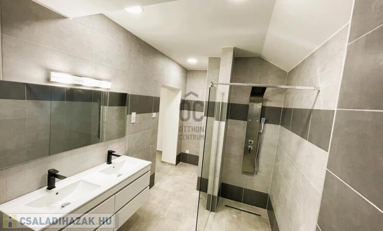- fürdőszobában dupla mosdókagyló, valamint a térérzetet növelő üveg zuhanyfal található. A fürdőszoba mellett egy külön helyiségben kapott helyet a WC.