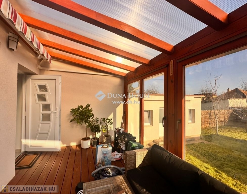 A teraszt hatalmas üvegportállal beépítették így a kapott télikerten keresztül jutunk be a tágas konyha-étkezőbe. Ebből a helyiségből nyílnak a szobák, a fürdőszoba és a mellékhelyiség is.