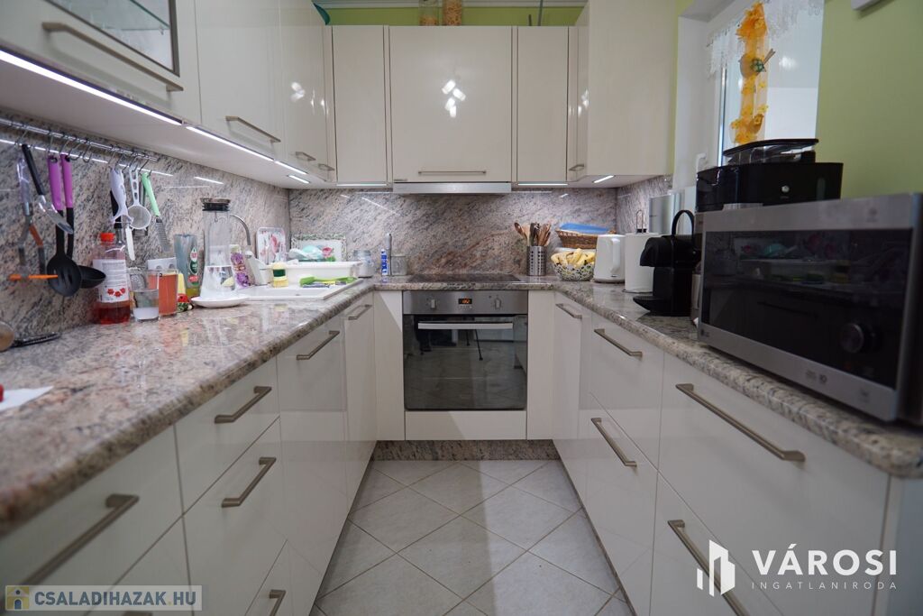 Amerikai konyha nappali étkezős kialakítású, teljesen felszerelt konyhával, (mosogatógép, tűzhely főzőlap....stb) saját vizesblokkal, közvetlen fedett teraszkapcsolttal, udvarkapcsolattal. Ezen épület alatt pincerész is található.