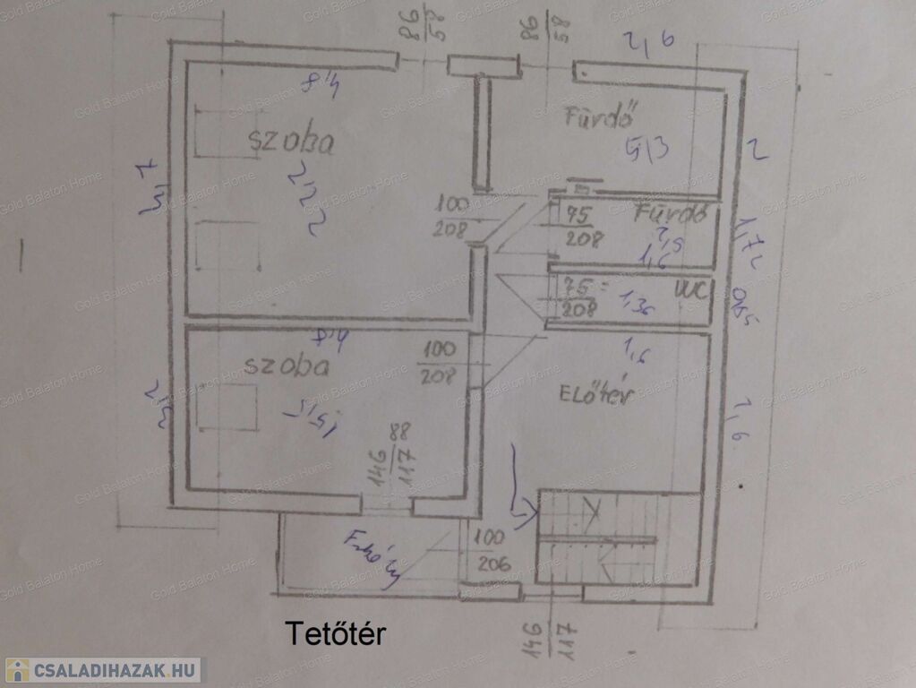 - tetőtér: előtér – társalgó, 2 szoba, fürdőszoba +WC, fürdőszoba, külön WC, erkély