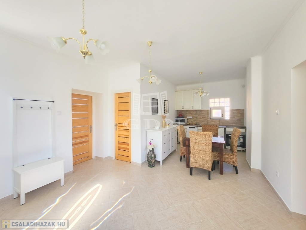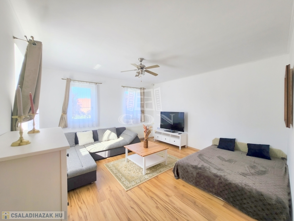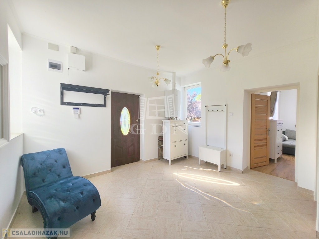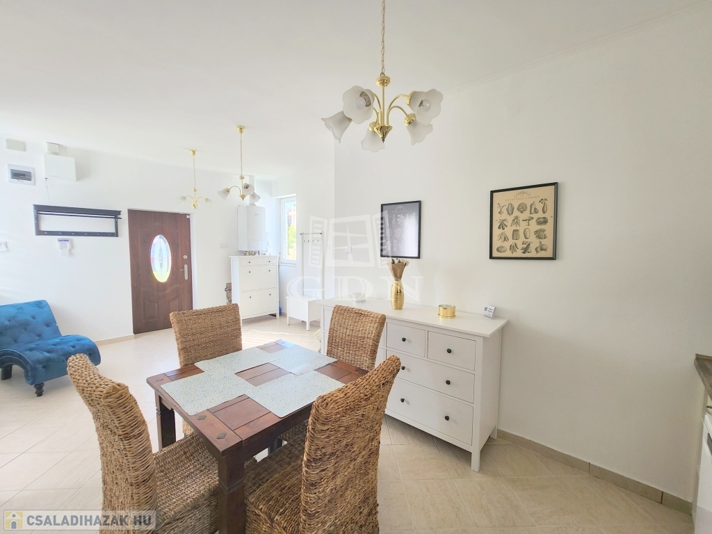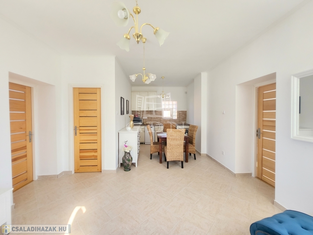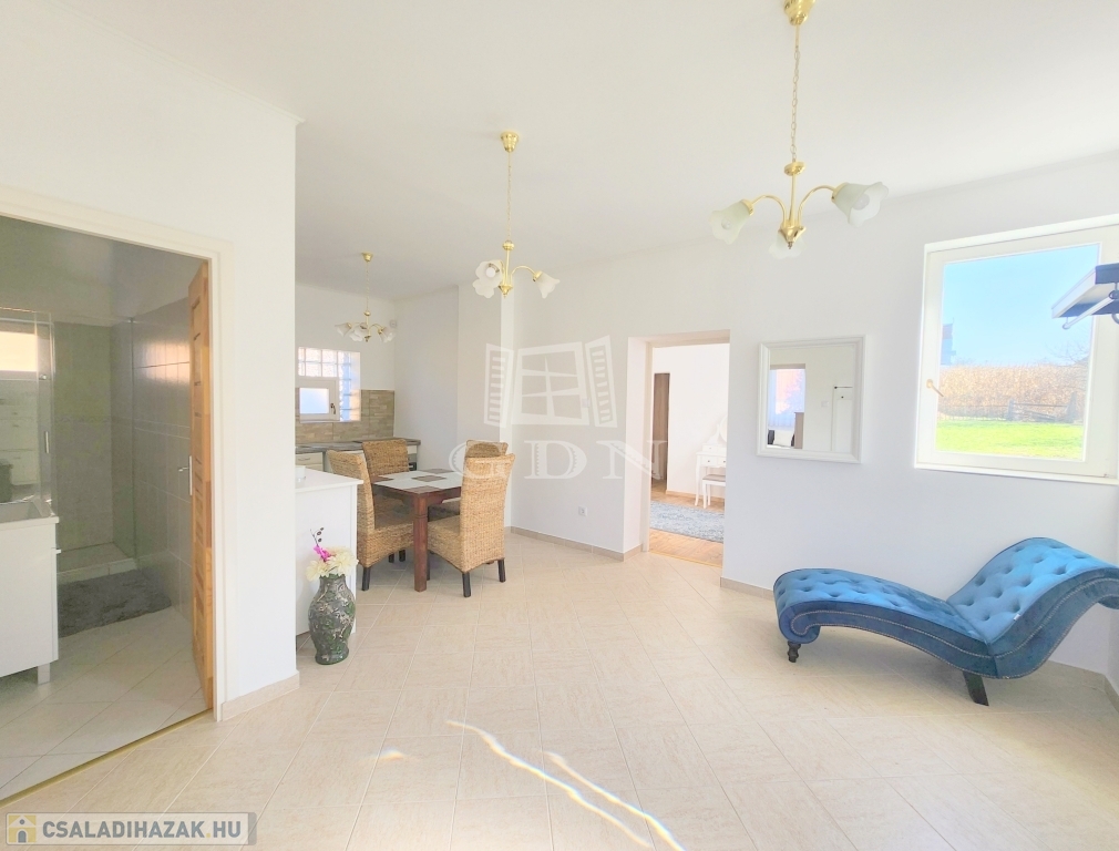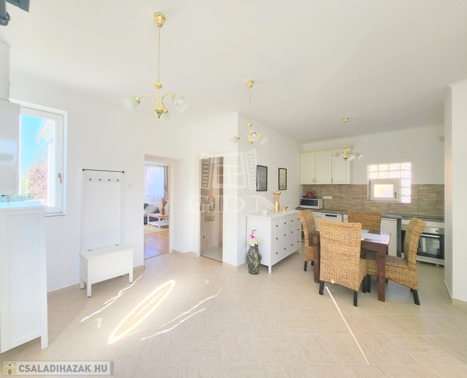 A családi ház kiváló elosztásából adódóan rendelkezésünkre áll egy tágas konyha - étkező, egy 25 m2 nagyságú nappali, mely 3 ablakkal rendelkezik, így nemcsak hangulatos életteret biztosít, de az állandó benapozottsága is garantált. Használhatunk további egy, külön bejáratú hálót, melyhez egy gardróbszoba is tartozik, valamint egy épített zuhanyzóval ellátott fürdőt.