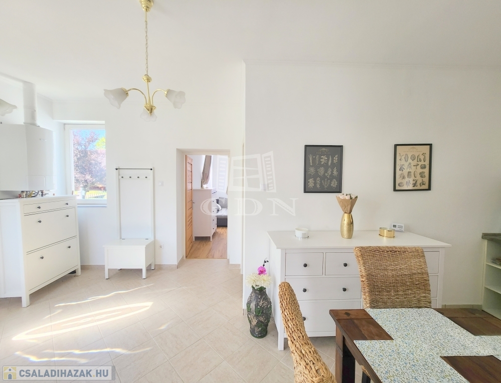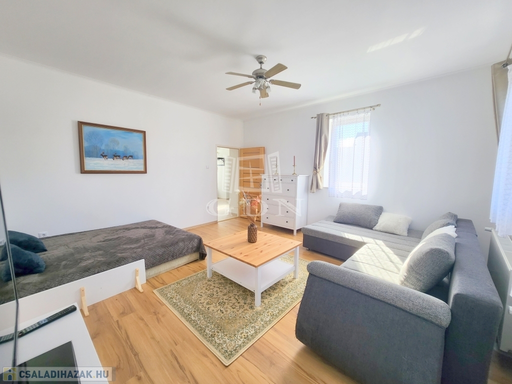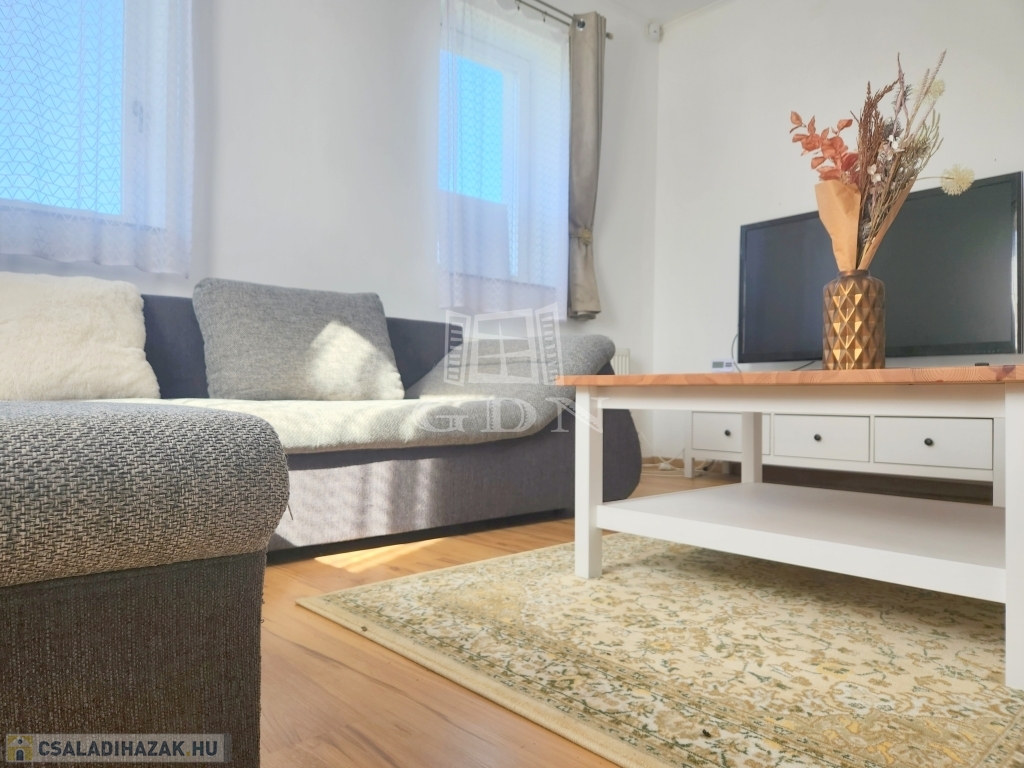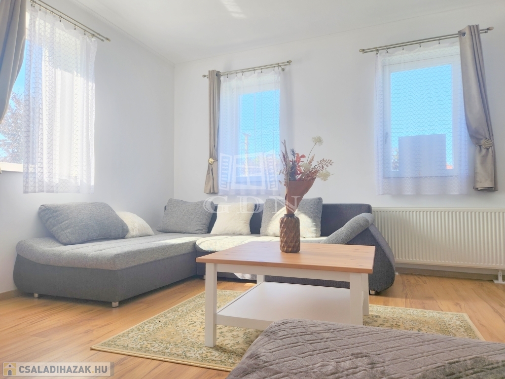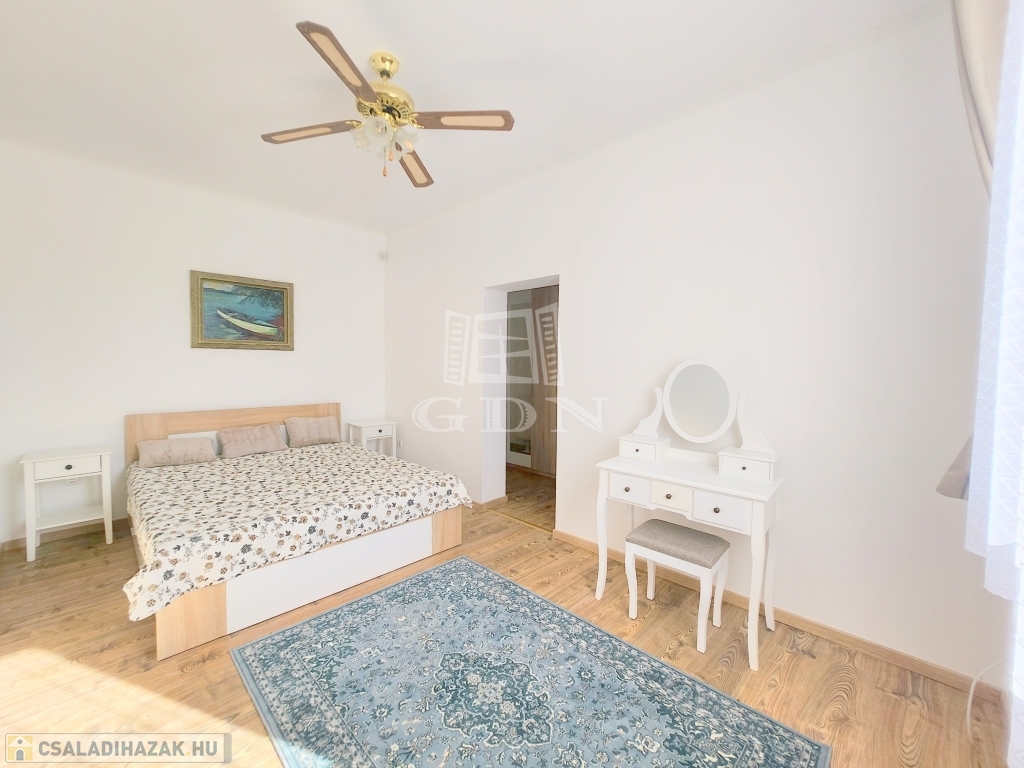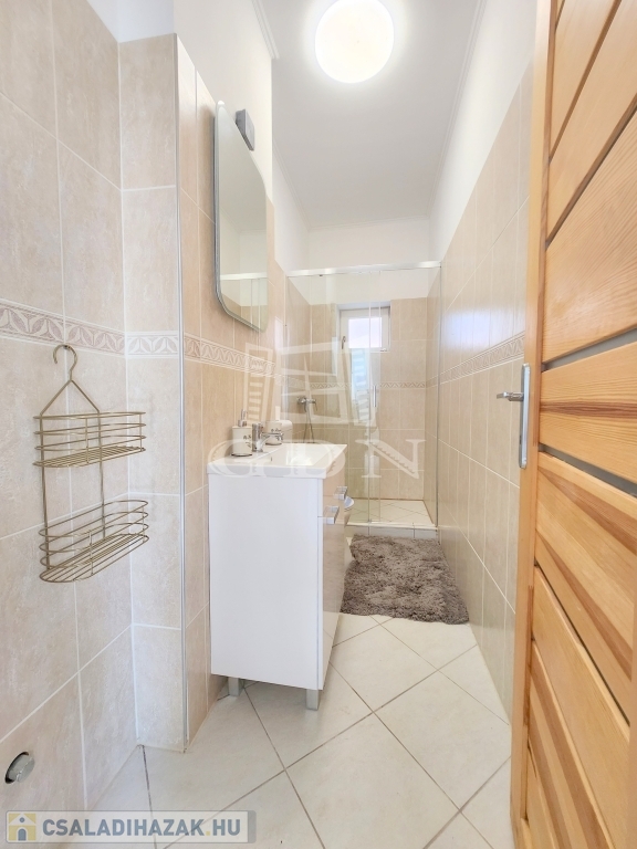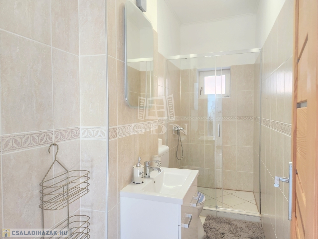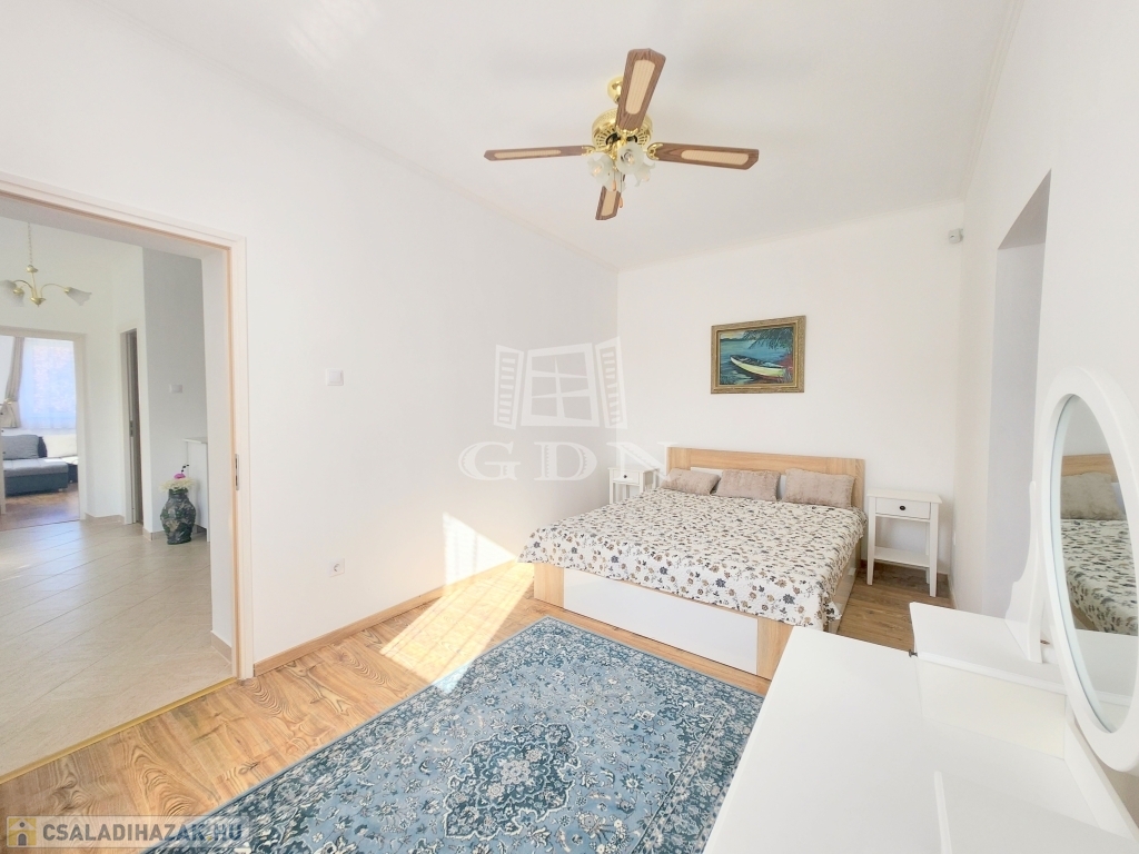 A családi ház kiváló elosztásából adódóan rendelkezésünkre áll egy tágas konyha - étkező, egy 25 m2 nagyságú nappali, mely 3 ablakkal rendelkezik, így nemcsak hangulatos életteret biztosít, de az állandó benapozottsága is garantált. Használhatunk további egy, külön bejáratú hálót, melyhez egy gardróbszoba is tartozik, valamint egy épített zuhanyzóval ellátott fürdőt.