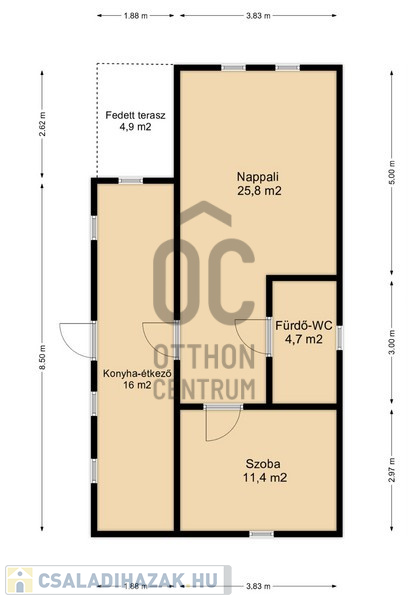 - Helyiségei: 2 szoba, étkező- konyha, fürdőszoba-WC, fedett terasz.