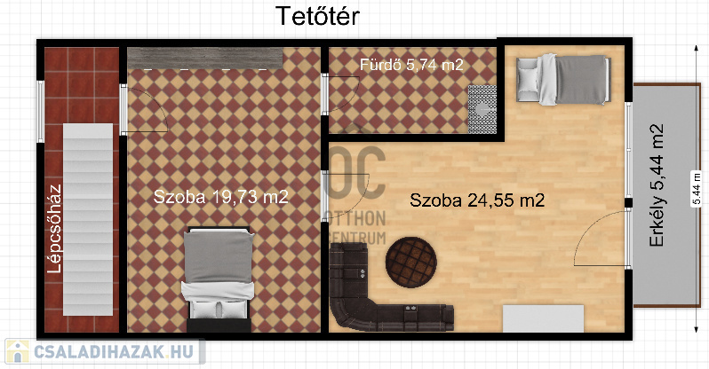 A házhoz tartozik egy fedett, 18,42 nm-es terasz, egy 5,44 nm-es erkély, garázs és tároló helyiség is.