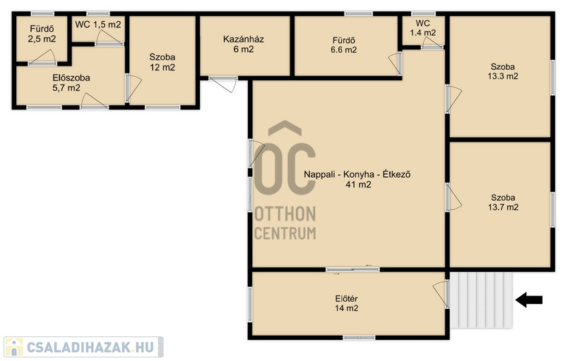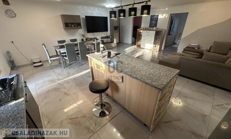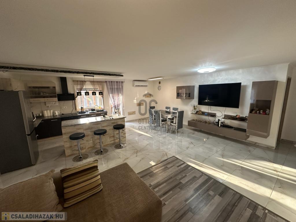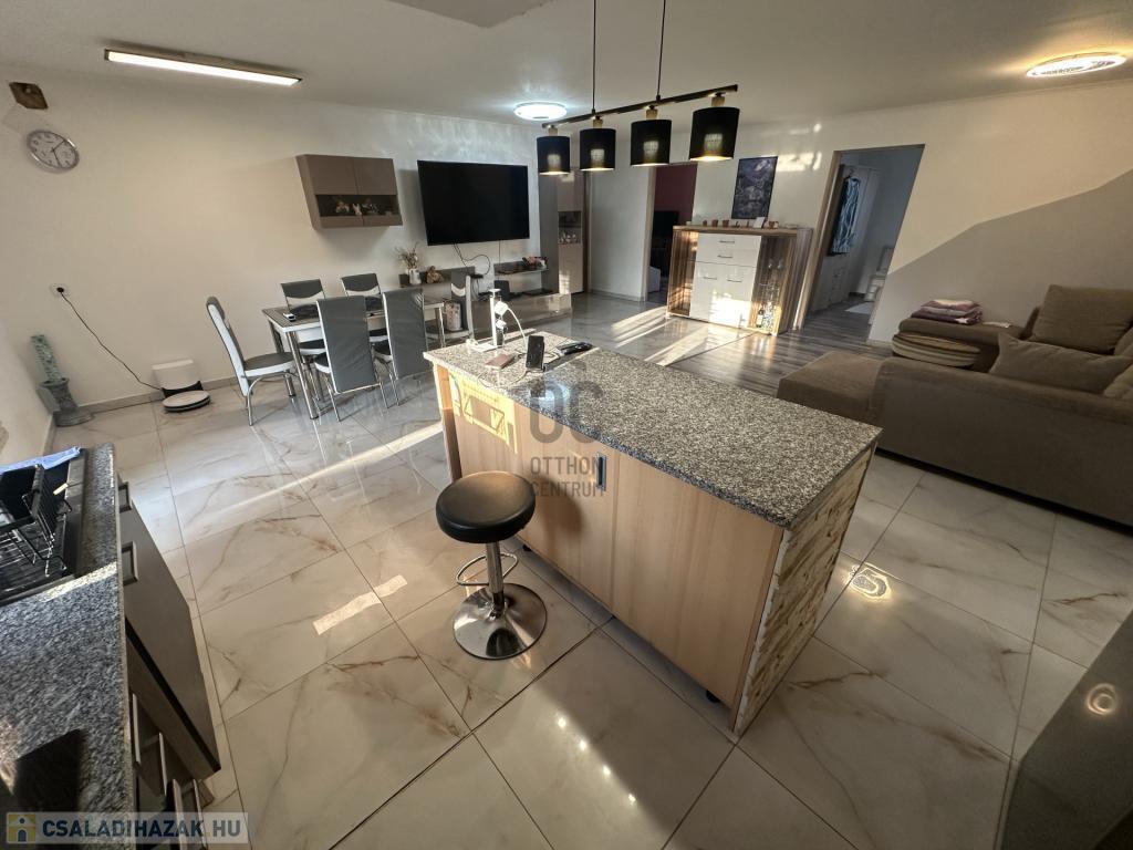 A burkolatok és a helyiségek elosztása a mai, modern igényeknek megfelelő, ezt az érzetet tovább fokozza az amerikai konyhás nappali.