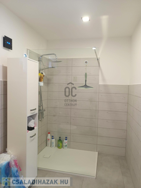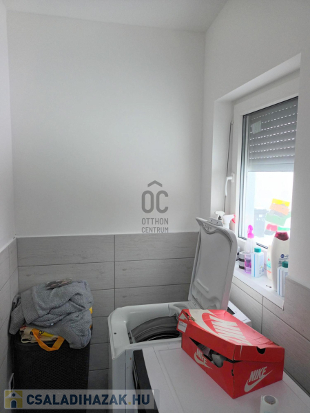A szobákba jó minőségű laminált padlóburkolat került (több réteg alátét-szigeteléssel), a többi helyiségben szintén nagyon jó minőségű járólap van. A házba minőségi anyagok kerültek beépítésre, precíz kivitelezéssel.