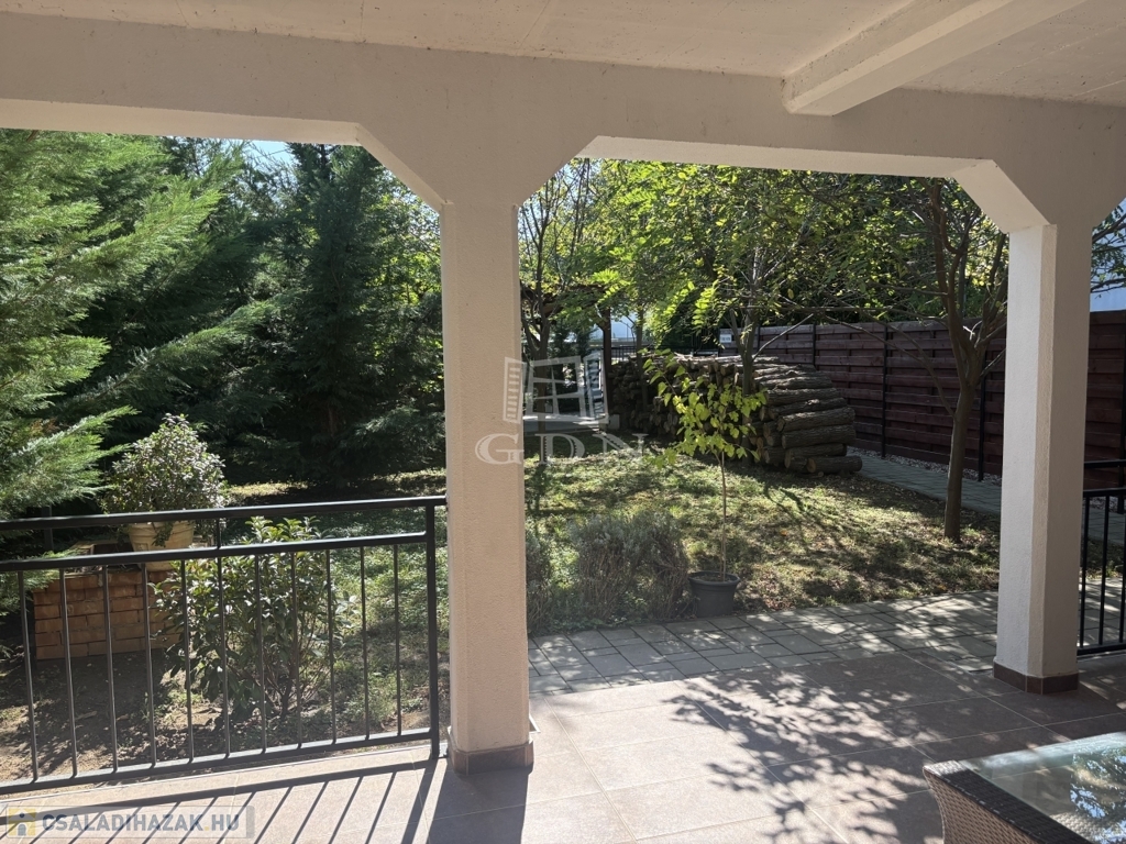 terasz előtt egy kellemes méretű, örökzöldekkel és rózsaszín akácokkal gazdagon beültetett, nyáron zöld