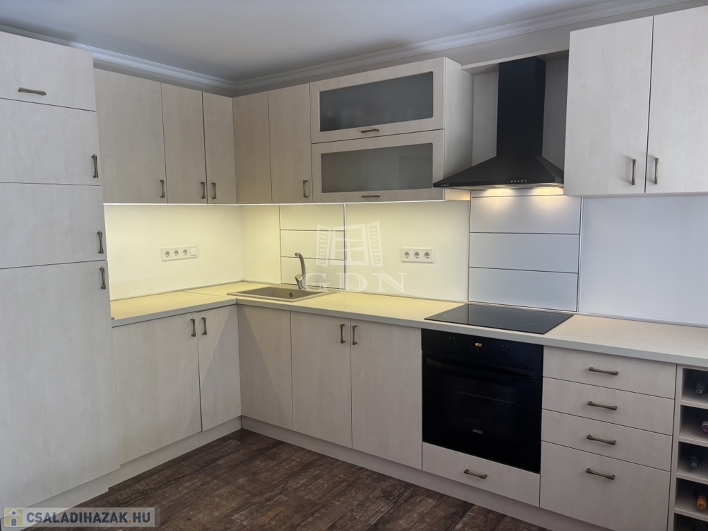lakórész 75 nm + 25 nm déli tájolású, fedett terasz. Nappali és konyha közvetlen teraszkapcsolattal, két