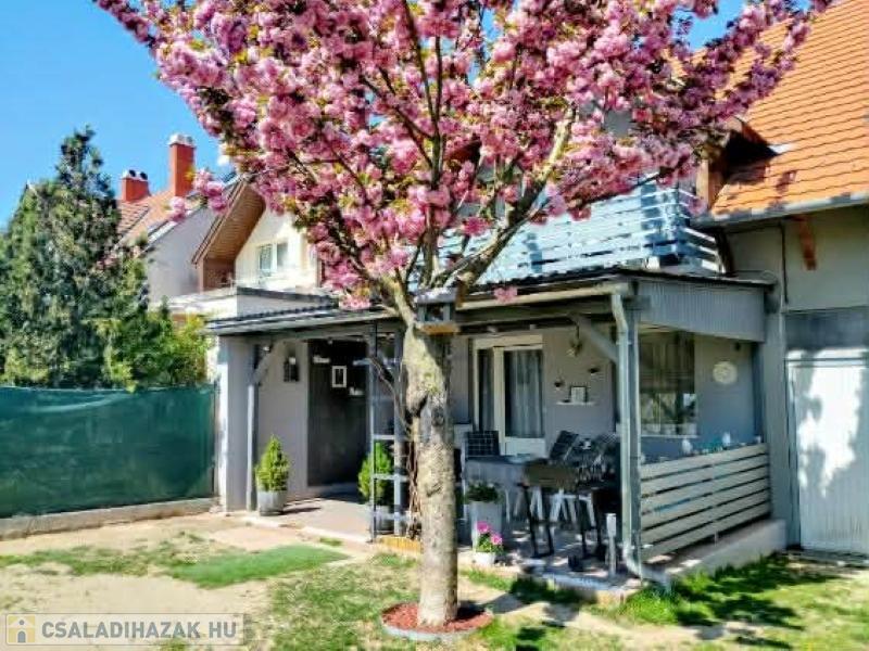 A Balaton déli partján, Zamárdiban 136 m2-es 4 hálószobás ház eladó. A város zöldövezeti részén, 444 m2-en telken fekvő kétszintes ház földszinti helyiségei: amerikai konyhás nappali, fedett terasz, háló, fürdő, wc. Az emeleten 3 háló, fürdőszoba, wc és egy jelenleg tároló/gardrób szobaként funkcionáló helyiség, amiből igény esetén még egy szoba kialakítható. A 25 m2-es fedett autóbeálló beépítésére is van lehetőség. Az emeleten egy szoba erkélyre nyílik, a földszinten az amerikai konyhás nappali pedig terasz kapcsolatos. A szomszédos egységeket dupla 38 cm-es Porotherm tégla választja el, a két egység között légréssel, így az ingatlan teljesen szeparált. A ház 2005-ben épült, azóta többszöri felújításon esett át, kívül-belül jó állapotú. Automata kapunyitás és riasztó vezetékes előkészítése megtörtént. Fűtéséről cirkó gázkazán gondoskodik, radiátoros hőleadással, az emeleten hűtő-fűtő klíma biztosítja a kellemes hőmérsékletet. A lakótér alapterülete 109 m2, a terasz, erkély, autóbeálló 50%-kal került beszámításra.