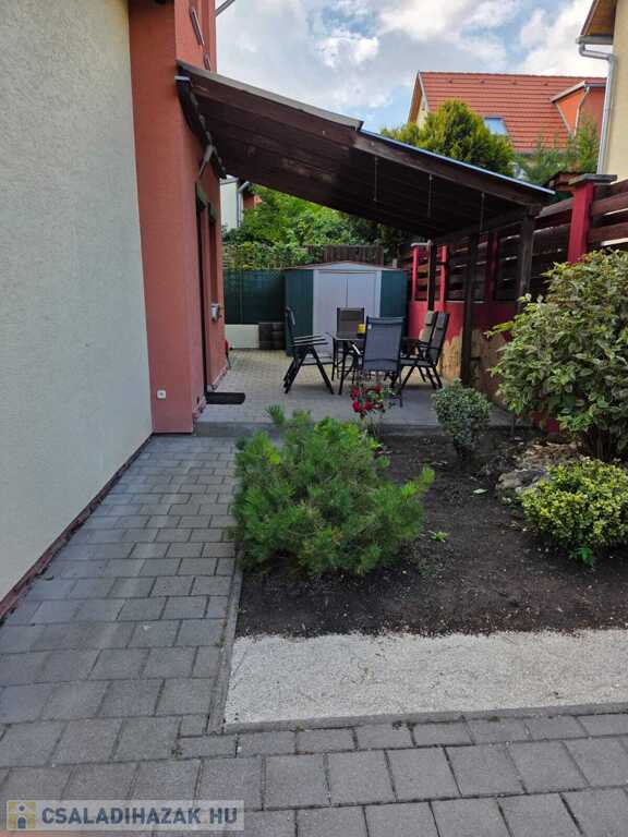 A kertnek egy kis része füvesített, amelyre második autóval be lehet állni, egyébként egy autó beállására alkalmas viacolorral fedett terület található. Megtalálható még a kertben egy kerti szerszámok, biciklik...tárolására alkalmas fém kis ház is.