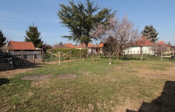 A 680 m²-es, sík telken található egy nagy barackfa, amely alatt árnyas kiülő létesíthető. Az intim, kedves hangulatú kert nem elhanyagolt. A locsolás 12 méteres fúrt kútból is megoldható. Több autó parkolására van lehetőség az udvaron és a ház előtt is.