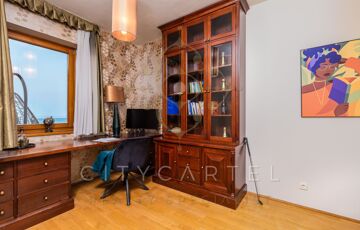 Galériás könyvtár / konditerem / társalgó, 2 hálószoba franciaerkéllyel és gardróbbal, nagyméretű fürdőszoba, tároló