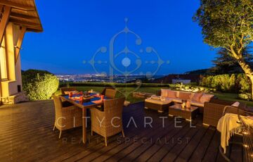 Panorámás, 50 nm-es kertkapcsolatos terasz – városi nappali és esti fényben úszó lenyűgöző látványával és erdei kilátással