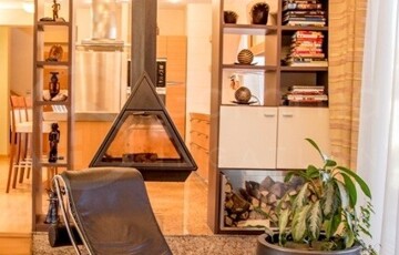 • Burkolatok és design: Listone Giordano parketta, Rimadesio tolóajtórendszer és egy egyedi Don Bar Design kandalló a nappali gyújtópontjában.