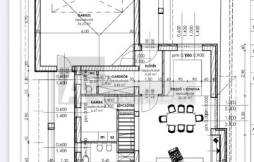 -földszint elrendezése: 34 m2-es garázs , előtér , gardrób, vendég mosdó , kamra és háztartási helyiség és a mediterrán otthonok központi tere a napfényes amerikai konyhás nappali , a közösségi élet színtere , amely elhúzható üvegajtóval kapcsolódik a teraszhoz és mediterrán parkosított kerthez, medencéhez,