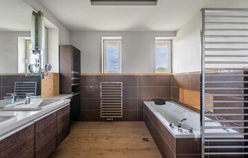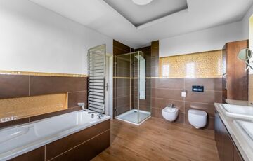 Az alsó szinten saját wellness-részleg várja az új tulajdonost: infra- és finn szauna, konditerem, borospince, valamint kétállásos garázs.