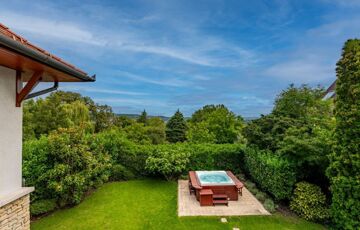 A nappali teraszkapcsolata közvetlenül a parkosított, automata öntözésű kertbe vezet, ahol 8 személyes jakuzzi és teljesen felszerelt kültéri konyha is helyet kapott.