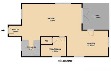 Magasföldszint: tágas, amerikai konyhás nappali (innen nyílik a nagy terasz), fürdőszoba és külön mellékhelyiség, közlekedő és lépcsőház.