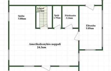 Az alsó szinten tágas előszoba, közlekedő, amerikai konyhás nappali, egy külön szoba, fürdőszoba és spejz található.